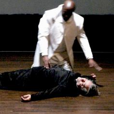 "Dans la mise en scène de LA SOLITUDE avec les acteurs américains à Atlanta, Éric Vigner a conçu le tracé au sol d’un ring. Dans ce spectacle, la langue de KOLTÈS semble s’enrichir de sa traduction américaine et le phrasé tour à tour hiératique, scandé et rythmé d’Isma’il Ibn Conner, l’acteur traducteur du texte et interprète du dealer, saisit sans détour ce perpétuel équilibre du texte, entre hauteur poétique et offensive triviale. On ne peut oublier en écoutant la charge incantatoire de l’américain que KOLTÈS se plaisait à dire qu’il voulait écrire pour des acteurs comme De Niro (boxeur dans RAGING BULL de Martin Scorsese) et que ce combat peut faire penser aux battles de rue, affrontements poétiques et scandés où il est d’usage de charrier son adversaire. La mise en scène d’ÉRIC VIGNER semble convoquer toute cette mythologie noire américaine en la configurant en tableaux comme une musique répétitive où l’on peut représenter une mort possible du client n’interdisant pas, par la suite, sa renaissance. Avec sa capuche, et le rythme de son phrasé ISMA’IL IBN CONNER qui interprète le dealer nous fait résolument penser à CASSIUS CLAY sur qui KOLTÈS écrivit un texte inoubliable : LE COUP FANTÔME."
